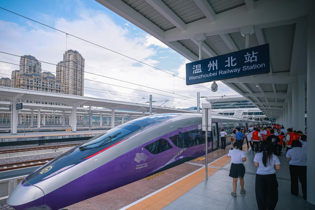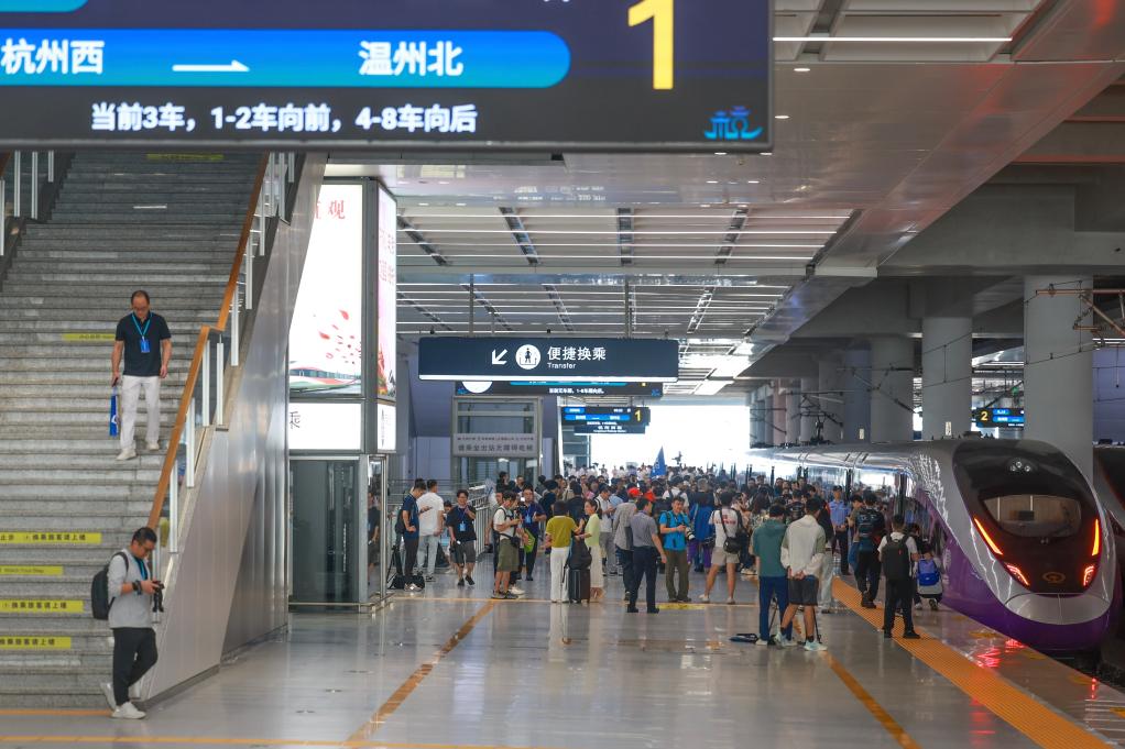 9月6日,從杭州西站開出的首發(fā)列車抵達溫州北站。新華社記者 江漢 攝