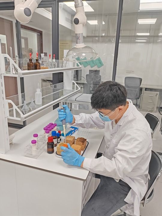 2024年7月8日,研究人員在杭州良渚古城遺址世界遺產(chǎn)監(jiān)測管理中心的潮濕環(huán)境土遺址保護實驗室進行試驗。 新華社記者 馮源 攝