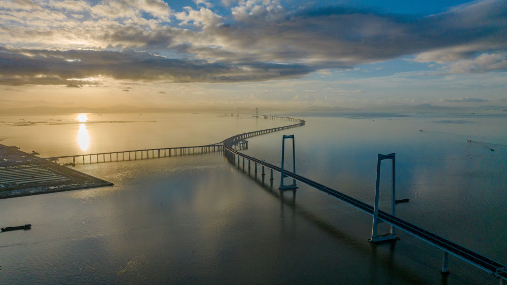 6月27日,沐浴在晨曦中的深中通道(無人機照片)。新華社記者毛思倩 攝
