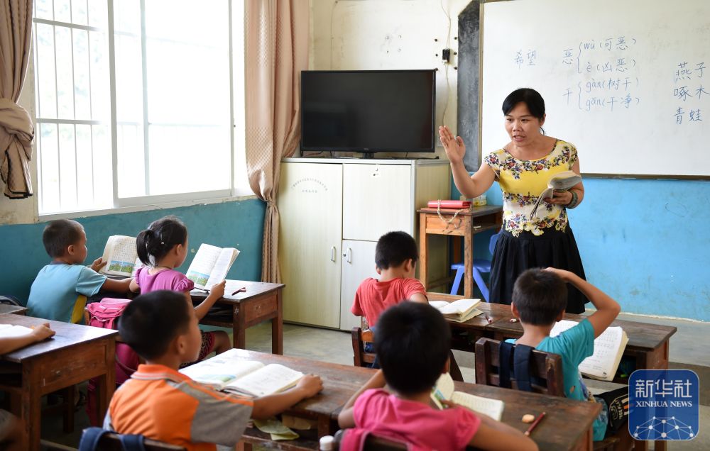 在廣西金秀瑤族自治縣忠良鄉(xiāng)更范教學(xué)點(diǎn),“85后”老師盧秀芬在給學(xué)生上課(2019年6月5日攝)。