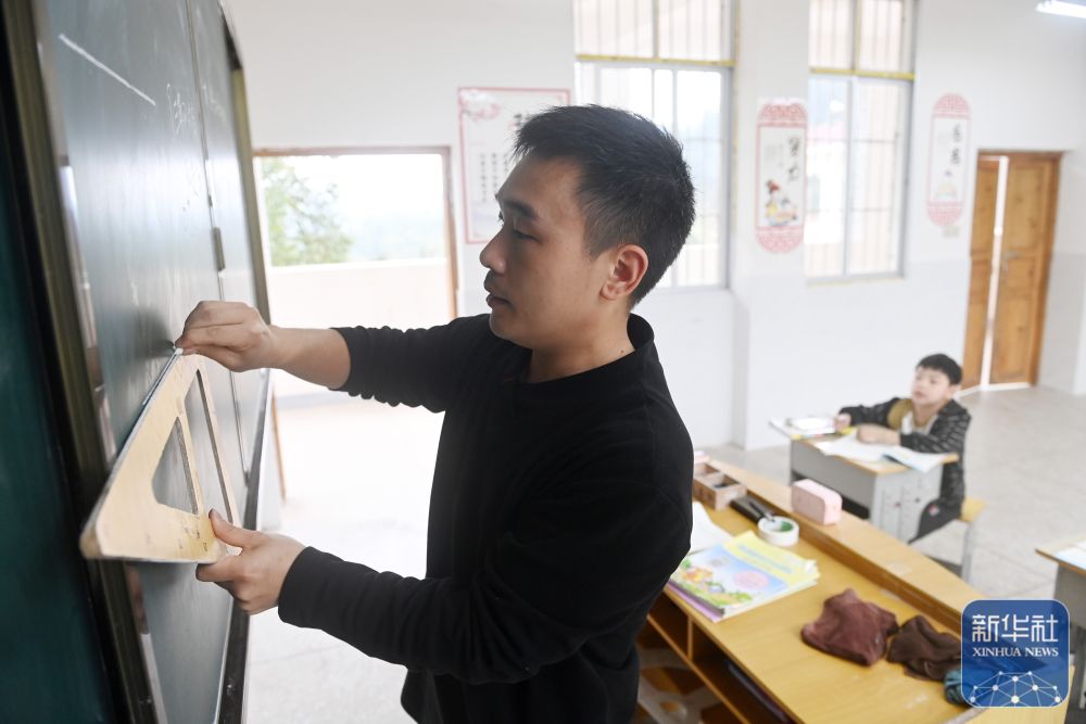 在廣西富川瑤族自治縣新華鄉(xiāng)湖廣小學(xué),“90后”老師謝其鶴在輔導(dǎo)學(xué)生功課(2019年3月20日攝)。