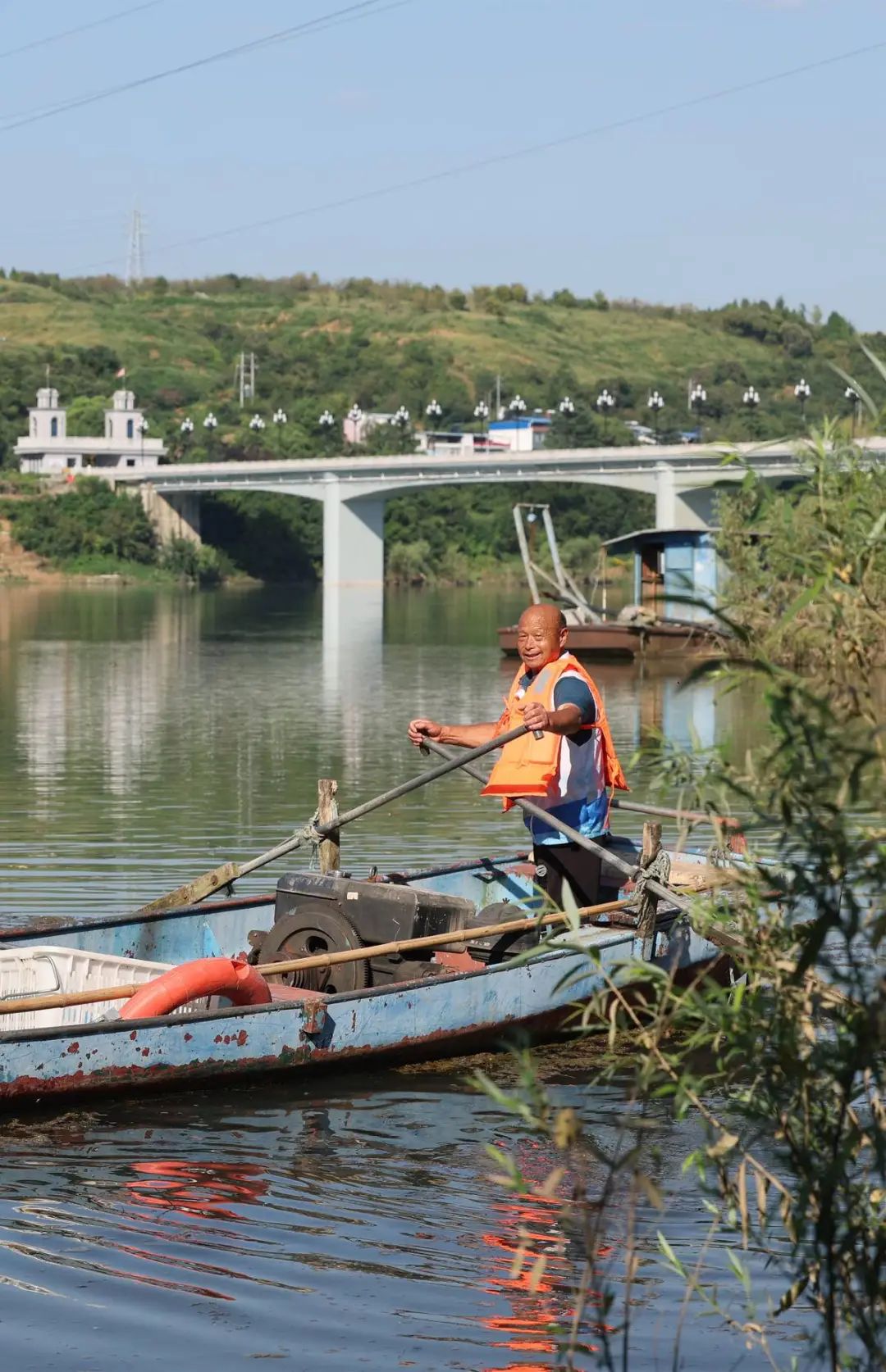 蔣德新在漢江上清理漂浮物。(湖北日?qǐng)?bào)通訊員 周俊沁 攝)
