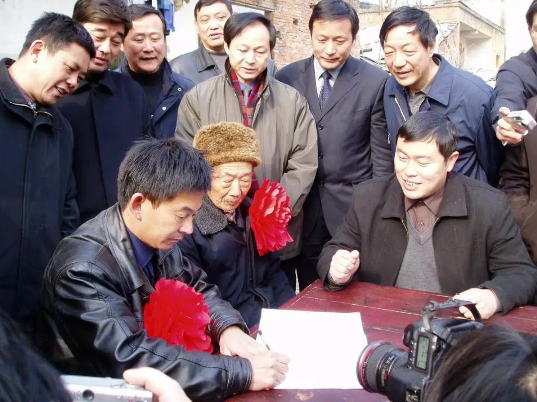 2005年1月5日,丹江口市三官殿辦事處馬灣村村民王瑞權(quán)(左一)與辦事處負(fù)責(zé)人簽訂搬遷合同,成為南水北調(diào)中線工程移民搬遷第一戶。(湖北日?qǐng)?bào)通訊員 陳華平 攝)