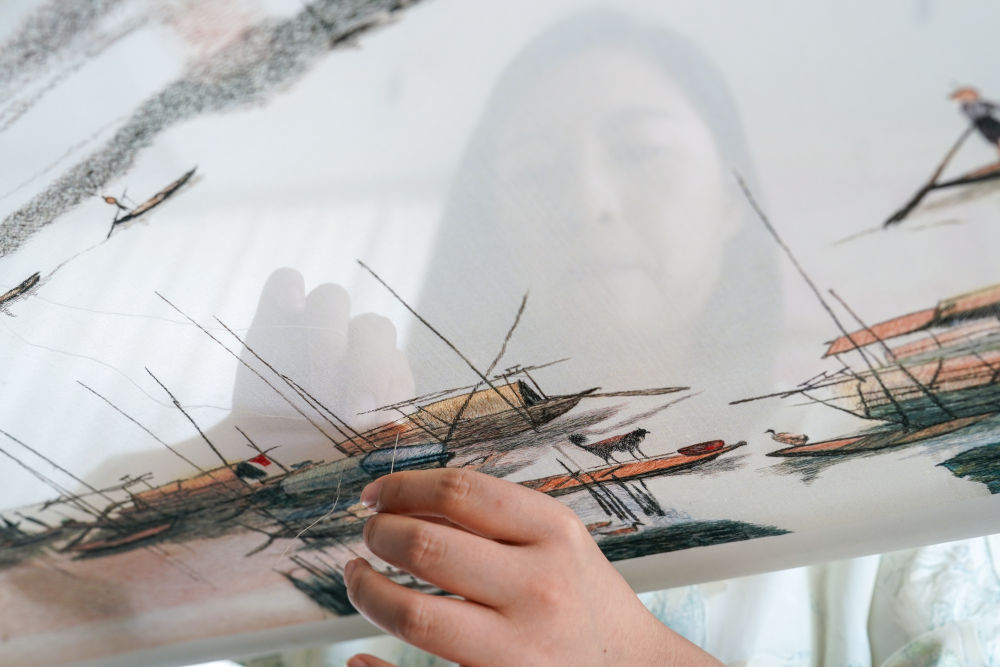 在蘇州高新區(qū)蘇繡小鎮(zhèn)的一家蘇繡公司,一位繡娘在加工蘇繡產品(7月3日攝)。