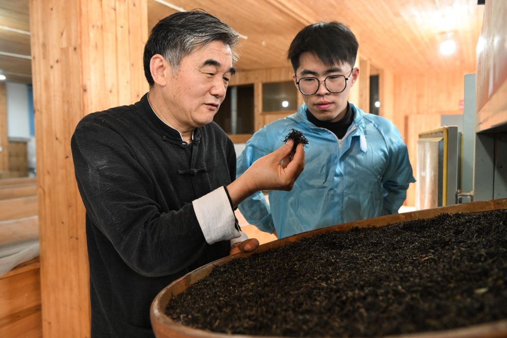 在蘇州市吳中區(qū)東山鎮(zhèn),蘇州市碧螺春制作技藝非物質文化遺產代表性傳承人嚴介龍在傳授徒弟紅茶制作要領(4月11日攝)。