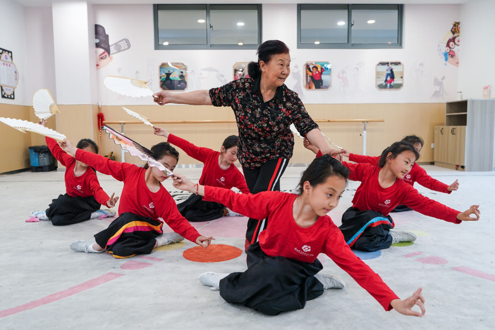 在江蘇蘇州昆山市石牌中心小學校“習美樓”的訓練房內,昆曲老師吳美玉(中)帶著小昆班的學員們進行扇舞訓練(5月30日攝)。