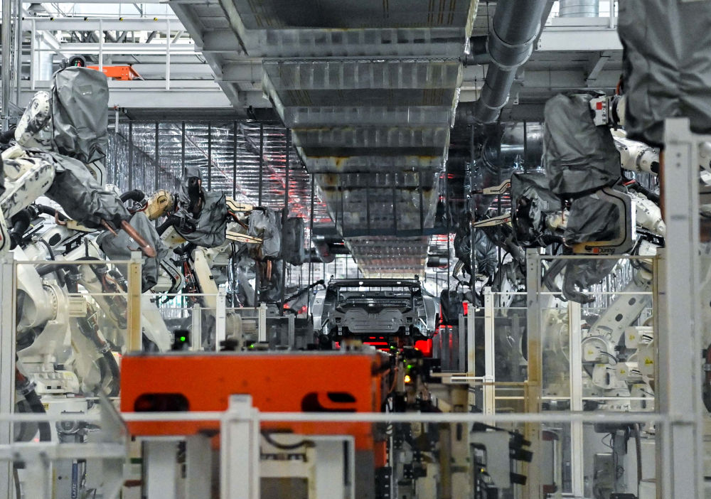 8月5日,在位于吉林省長(zhǎng)春市一汽紅旗制造中心繁榮廠區(qū)的焊裝車間內(nèi),焊裝機(jī)器人在生產(chǎn)線上焊接車身。新華社記者 顏麟蘊(yùn) 攝