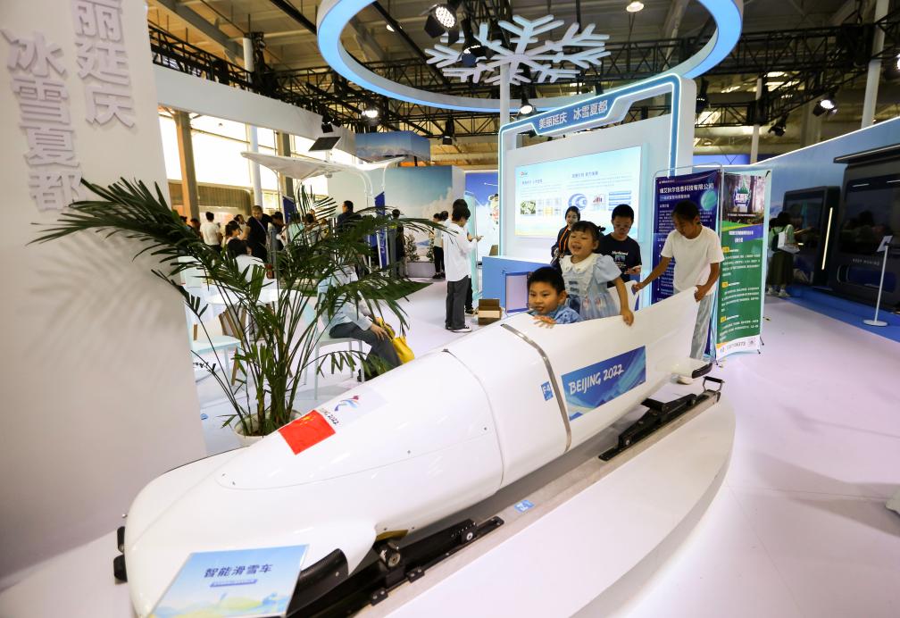 9月16日,在服貿(mào)會首鋼園區(qū),小朋友在“美麗延慶 冰雪夏都”展臺參觀體驗。新華社記者 鄒廣萍 攝