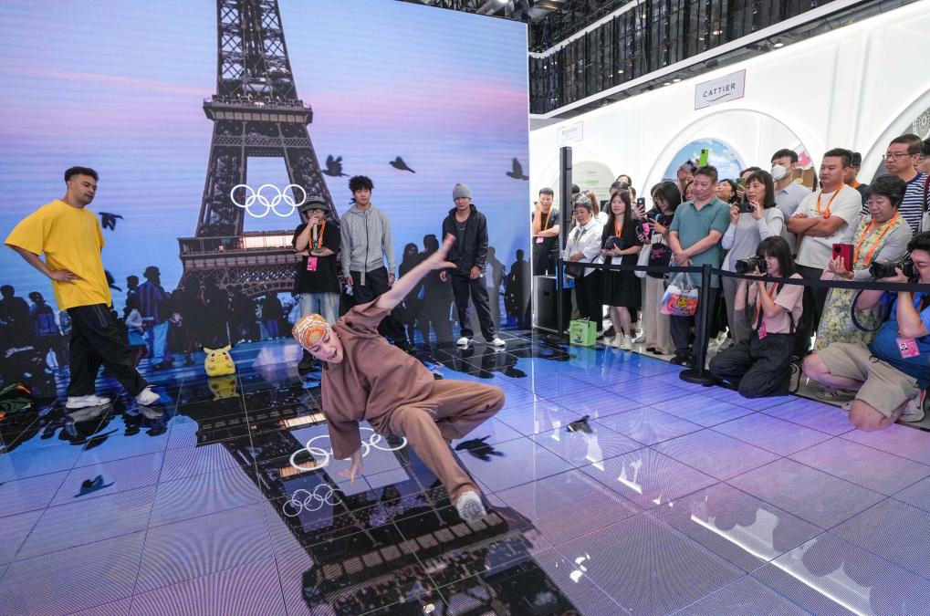 9月14日,在2024年服貿(mào)會國家會議中心綜合展區(qū)的主賓國法國展臺,中法兩國街舞好手在表演霹靂舞。新華社記者 陳曄華 攝