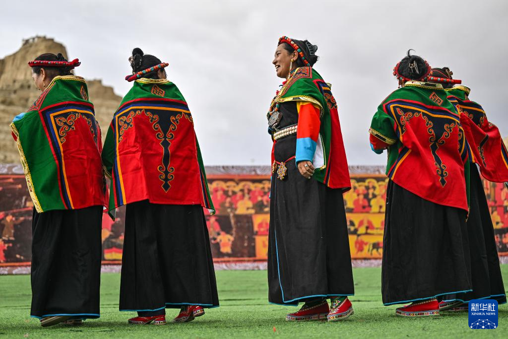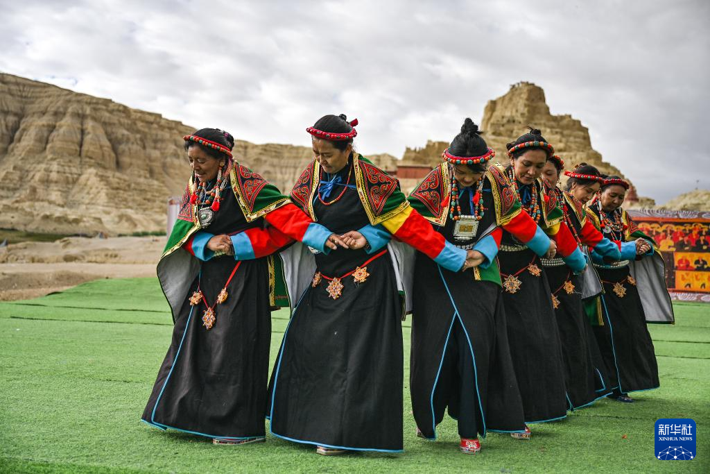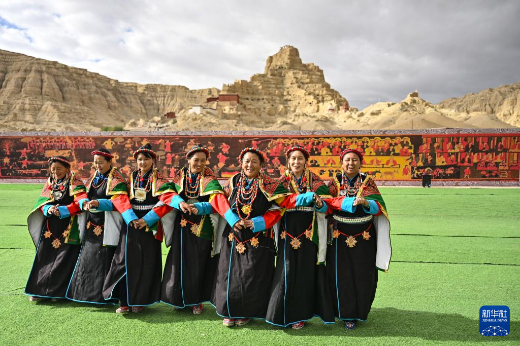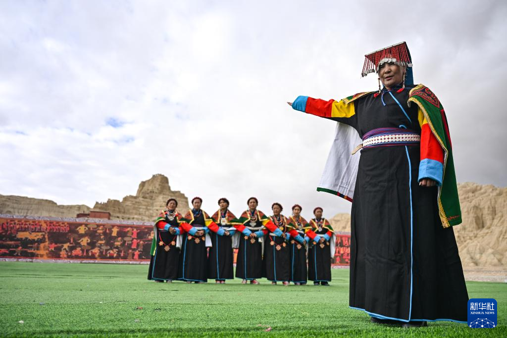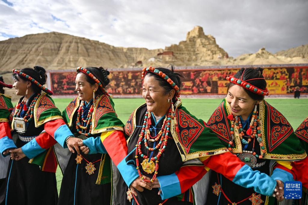 在西藏阿里地區(qū)札達(dá)縣古格王國遺址腳下,自治區(qū)級“宣舞”非遺傳承人央金(右)介紹“宣舞”(9月11日攝)。