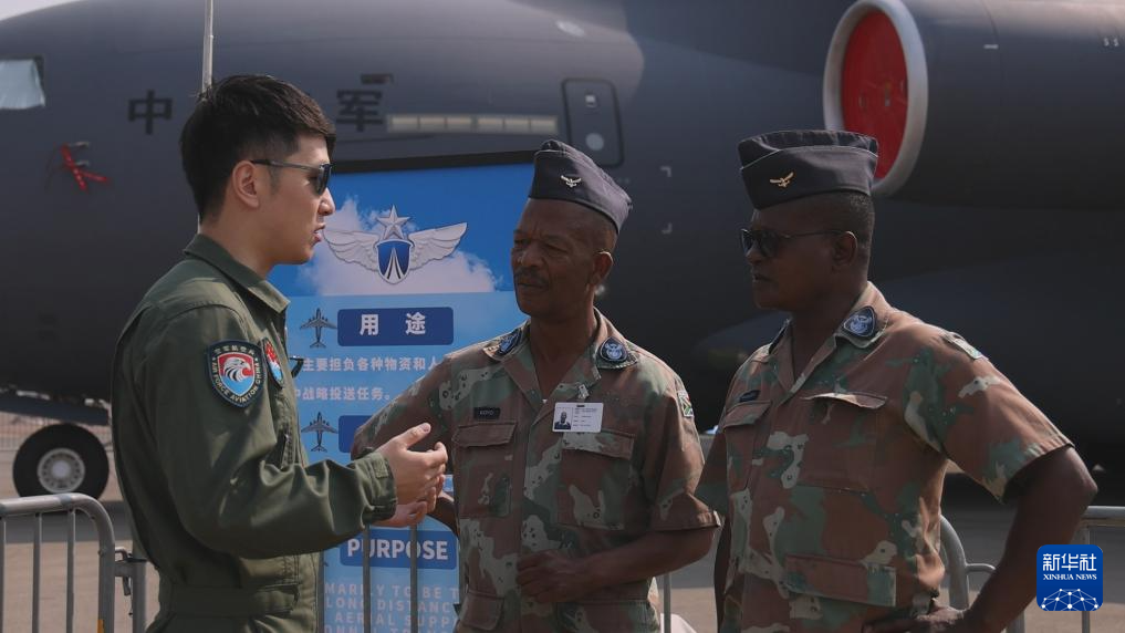 9月18日,中國空軍運-20機組成員在南非首都比勒陀利亞的非洲航空航天與防務展上向外國友人進行介紹。新華社發(fā)(王銳杰攝)