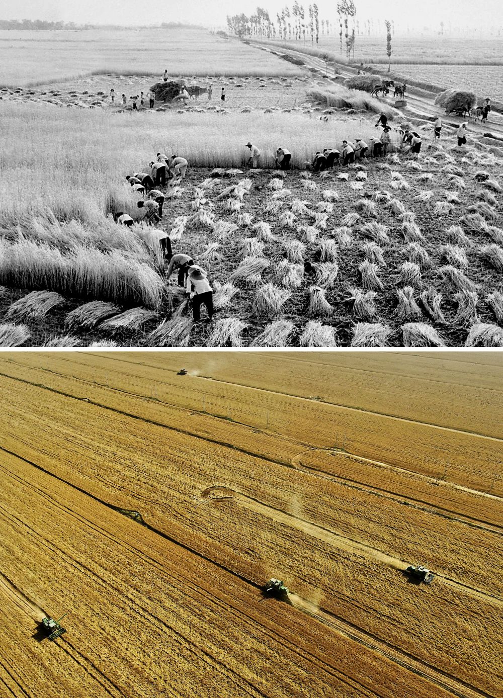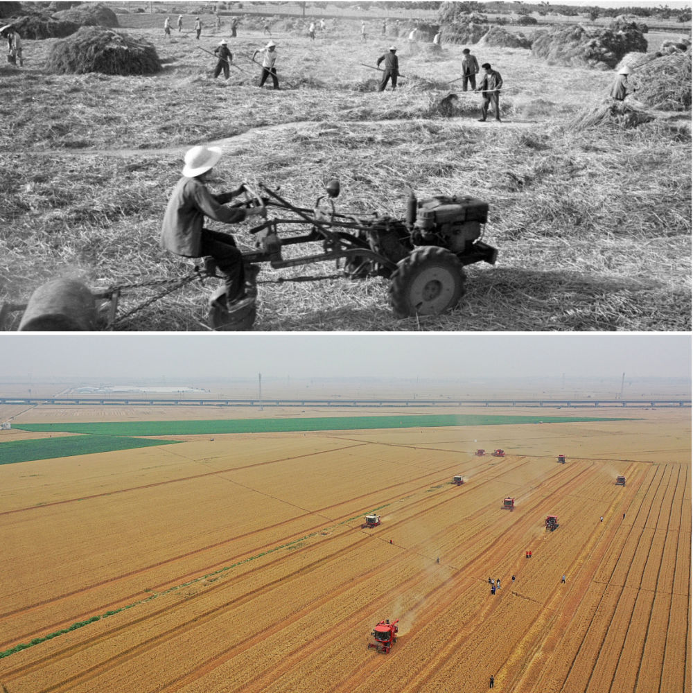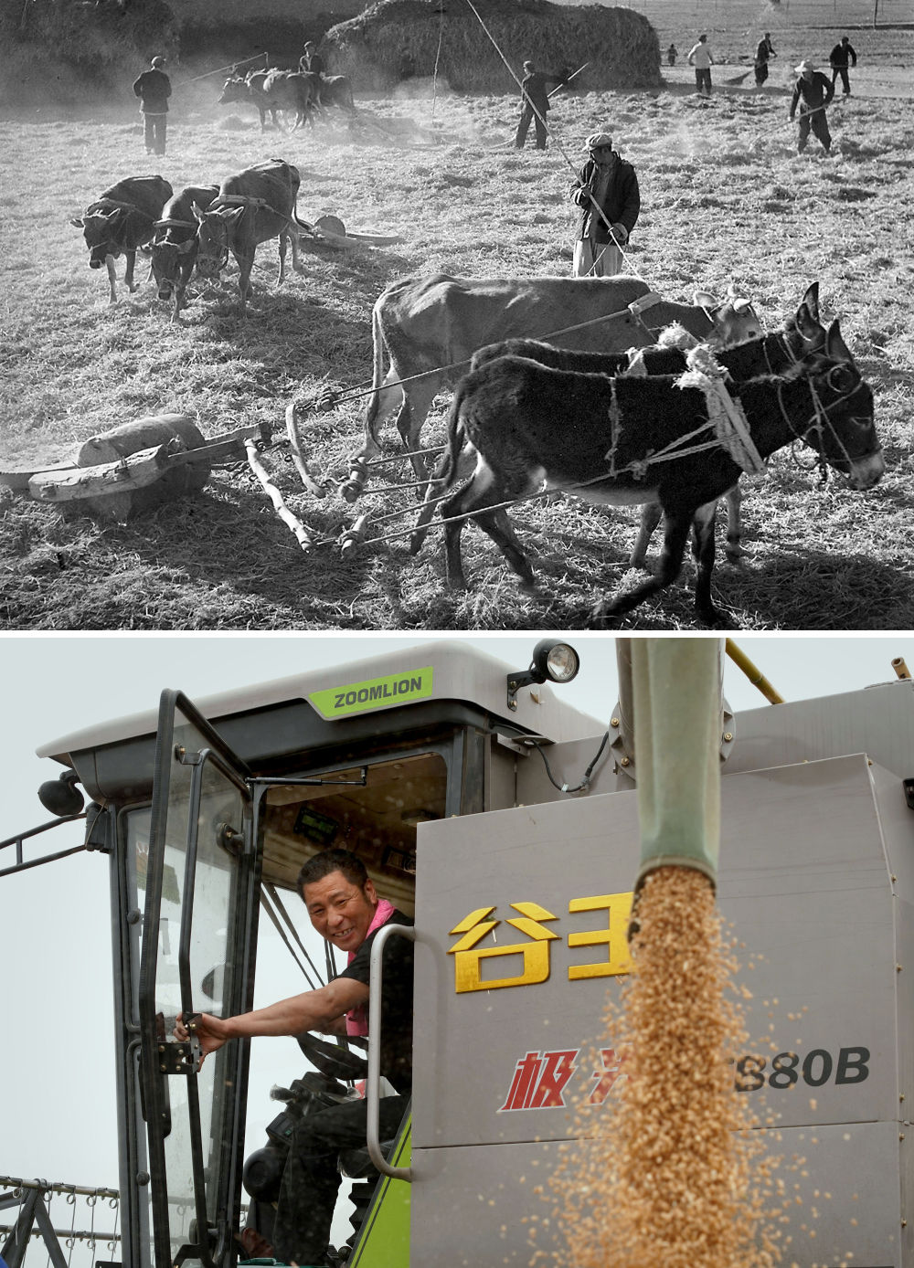 拼版照片:上圖為1965年,河南林縣(現(xiàn)林州市)上陶大隊(duì)第四生產(chǎn)隊(duì)的社員在碾麥打場(chǎng)(新華社記者 楊丙文 攝);下圖為2020年5月29日,在河南商水南陵村的一處麥田里,一位“麥客”將收割脫粒后的小麥直接裝車(新華社記者 李安 攝)。