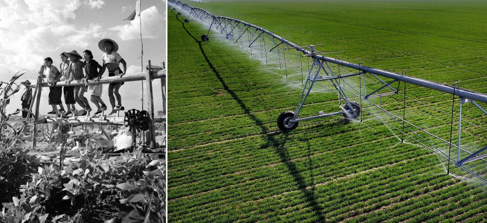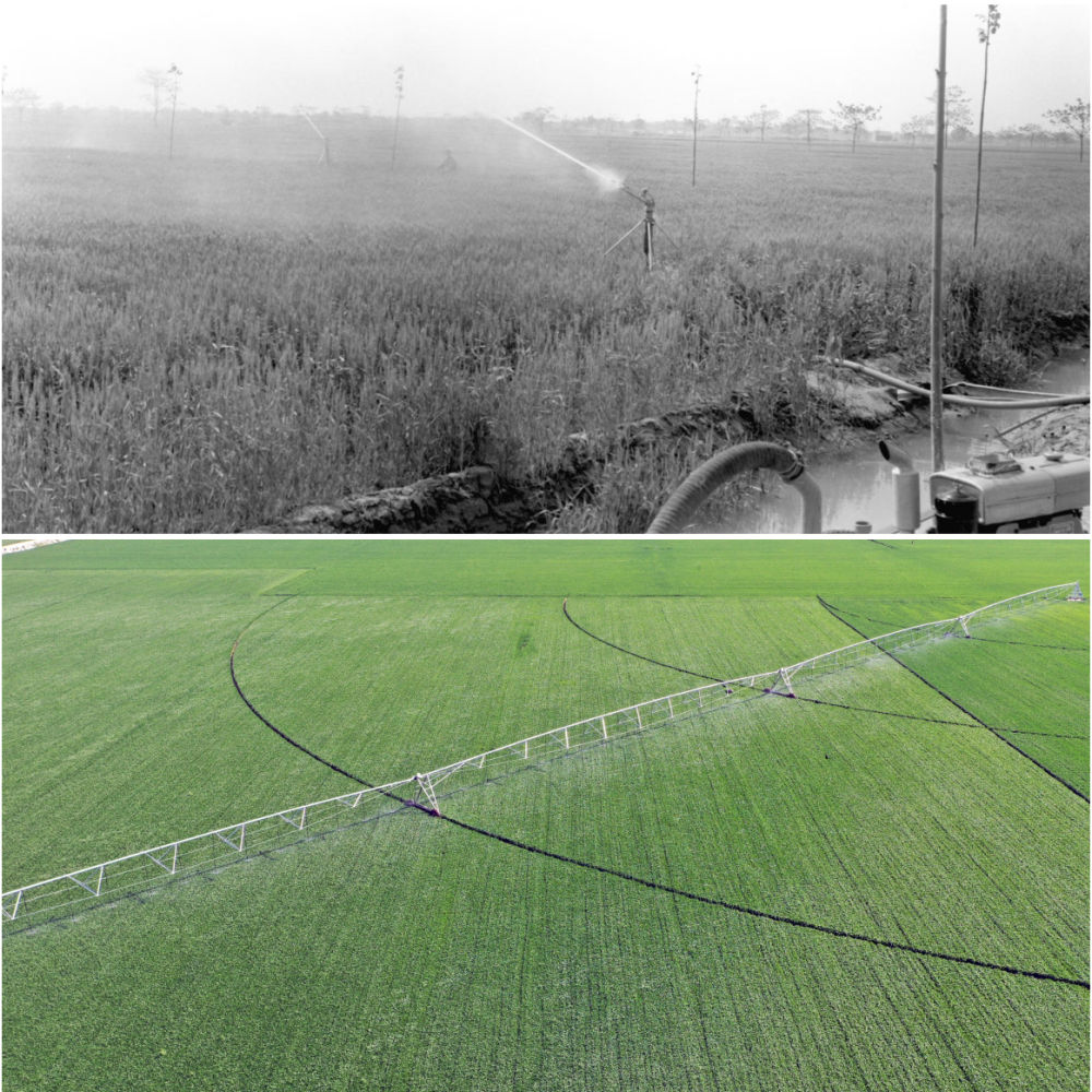 拼版照片:左圖為20世紀(jì)50年代,河南郾城萬(wàn)金公社社員在踩水車澆田(魏德忠 攝);右圖為2017年3月9日,在河南浚縣王莊鎮(zhèn)一處麥田里,自走式智能噴灌機(jī)在進(jìn)行噴灌作業(yè)(新華社記者 李安 攝)。