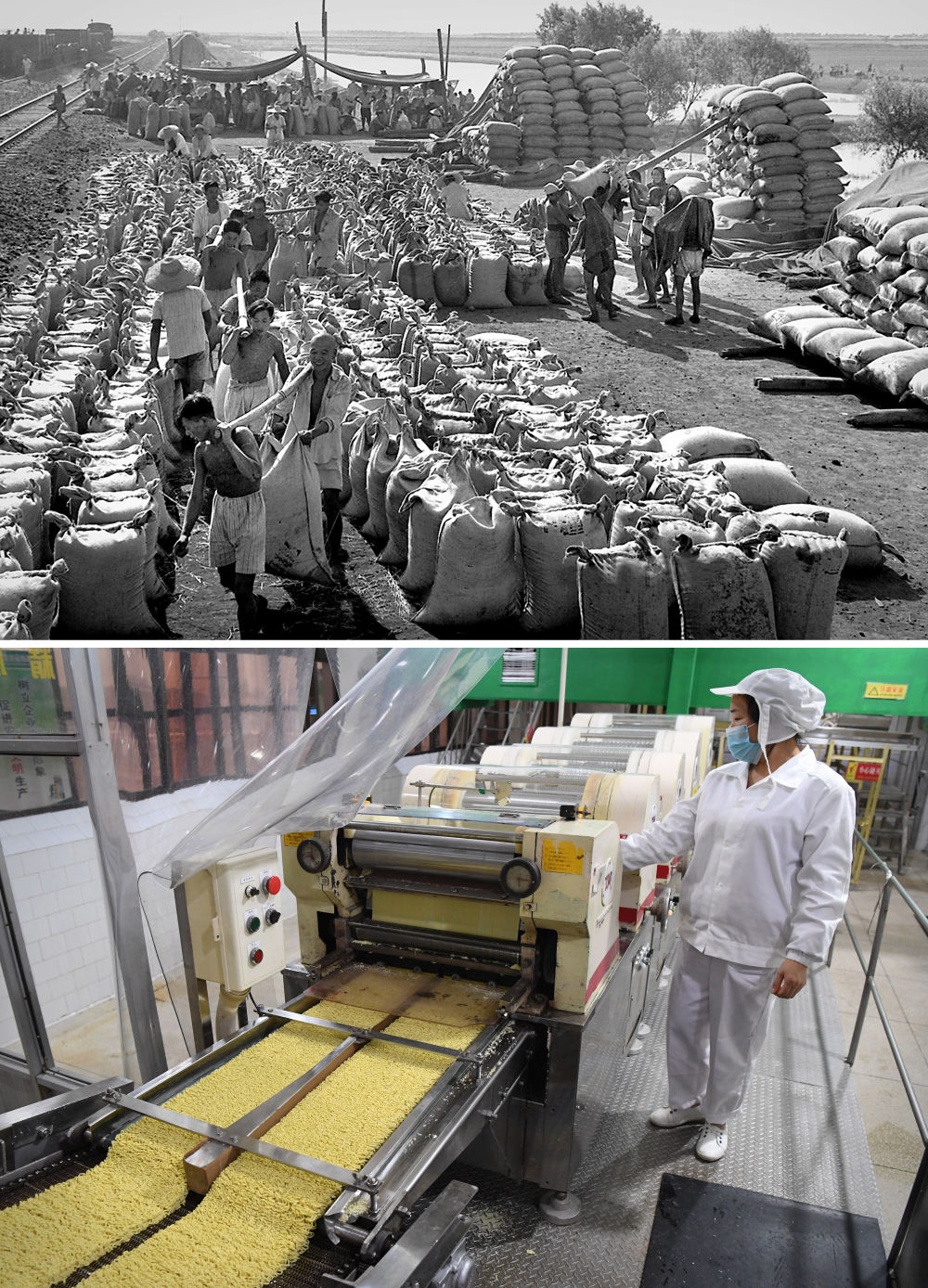 拼版照片:上圖為1963年,河南郾城裴城車站糧食收購(gòu)站,堆放著大批農(nóng)民交售的原糧(新華社記者 楊丙文 攝);下圖為2018年11月27日,在河南臨潁一家方便面生產(chǎn)企業(yè),工作人員在車間流水線上作業(yè)(新華社記者 李安 攝)。