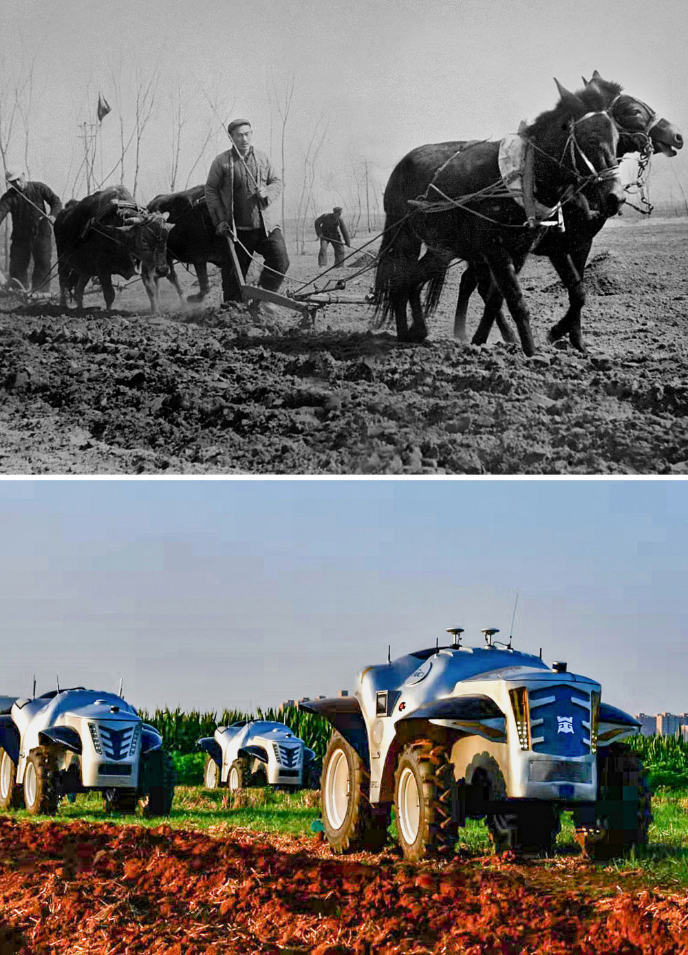 拼版照片:上圖為1954年,河南開封農(nóng)民在用傳統(tǒng)的畜拉步犁耕地(呂學(xué)召 攝);下圖為2019年7月26日,洛陽(yáng)一拖集團(tuán)生產(chǎn)的純電動(dòng)無(wú)人駕駛拖拉機(jī)準(zhǔn)備做耕地測(cè)試(潘郁 攝)。