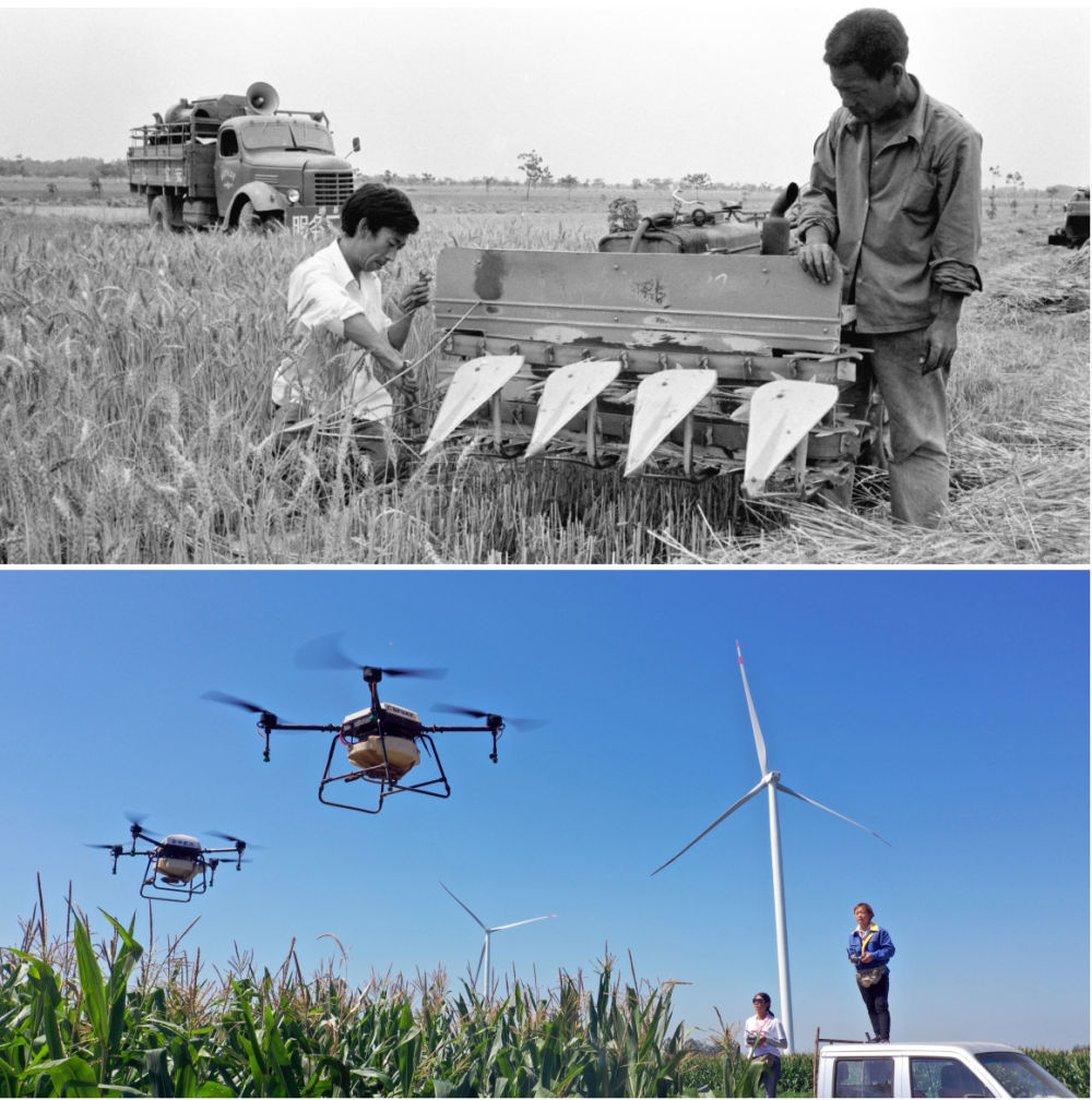 拼版照片:上圖為1986年,河南??h農(nóng)機(jī)公司組織服務(wù)隊(duì)走村串鄉(xiāng)義務(wù)修理農(nóng)業(yè)機(jī)械(新華社記者 唐茂林 攝);下圖為2020年9月4日,河南湯陰“精忠飛防大隊(duì)”飛手在操作植保無(wú)人機(jī)(新華社記者 李嘉南 攝)。