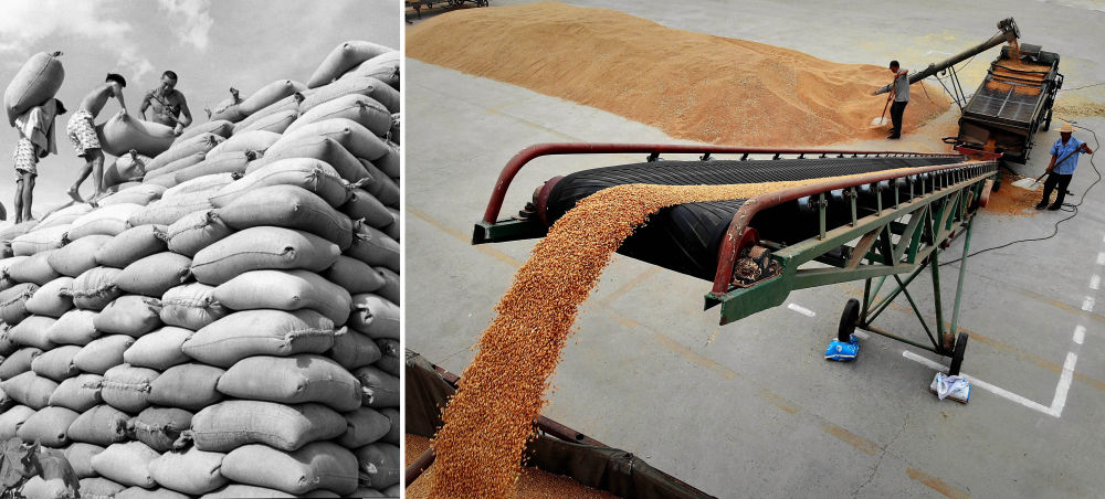 拼版照片:左圖為1959年,河南黃泛區(qū)農(nóng)場(chǎng)員工在堆放剛收打的小麥,準(zhǔn)備入倉(cāng)(新華社記者 楊震河 攝);右圖為2018年6月4日,在河南黃泛區(qū)農(nóng)場(chǎng),工作人員將剛收打的小麥過(guò)篩后直接裝車,準(zhǔn)備運(yùn)往糧庫(kù)(新華社記者 李安 攝)。