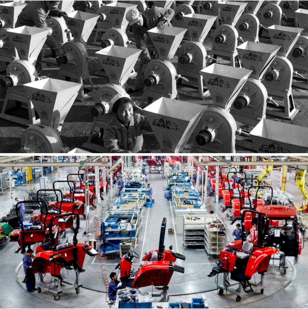 拼版照片:上圖為1971年,河南禹縣(現(xiàn)禹州市)生產(chǎn)的大批粉碎機(jī)準(zhǔn)備運(yùn)送出廠(蔡玉琦 攝);下圖為2012年9月12日拍攝的河南洛陽(yáng)一拖集團(tuán)東方紅拖拉機(jī)生產(chǎn)線(新華社發(fā))。