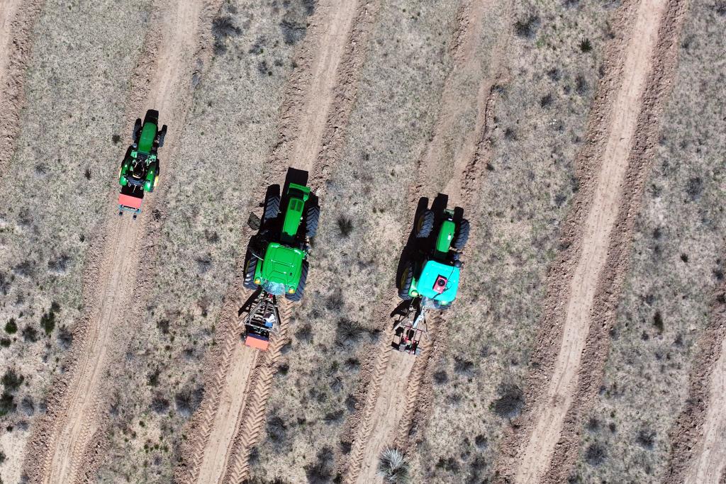 6月15日,在地處黃河“幾字彎”的內(nèi)蒙古庫布其沙漠防沙治沙項目區(qū),工人駕駛牽引播種機種檸條(無人機拍攝)。新華社記者 李云平 攝