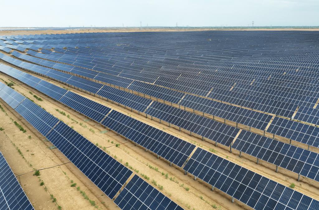 這是7月5日拍攝的內(nèi)蒙古烏蘭布和沙漠防沙治沙和風(fēng)電光伏一體化項目區(qū)(無人機拍攝)。新華社記者 李云平 攝