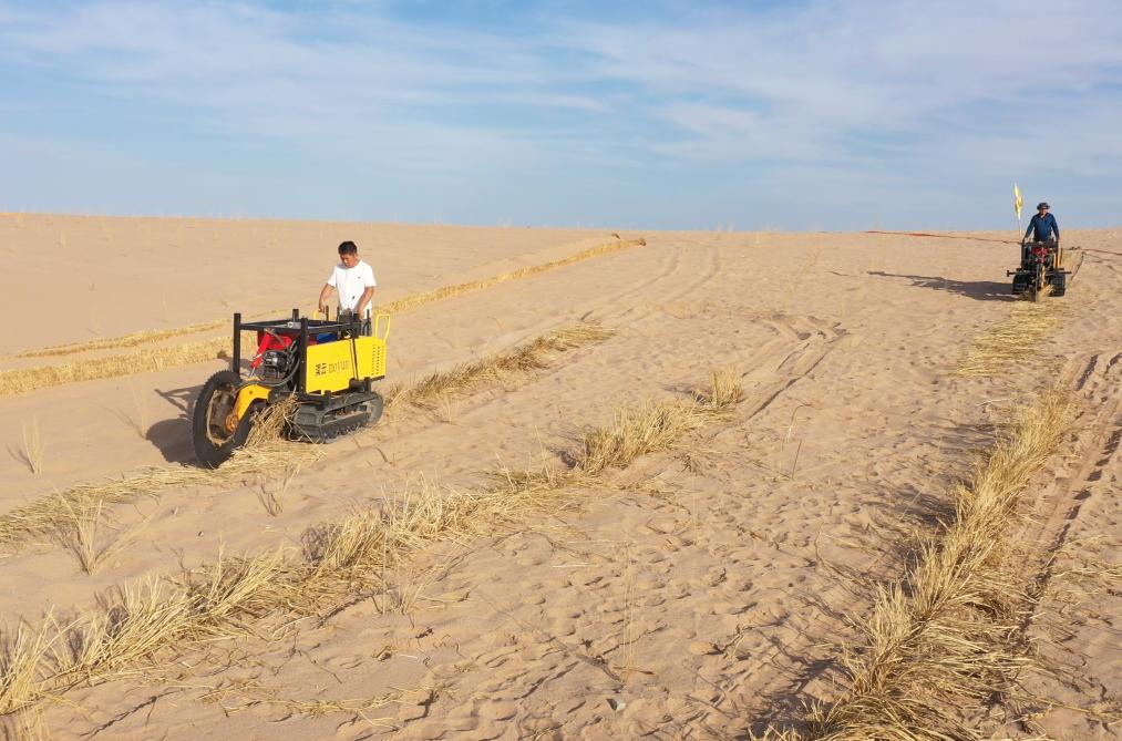 6月16日,內(nèi)蒙古巴彥淖爾市烏拉特后旗西補隆林業(yè)管護中心職工駕駛機械壓沙障。新華社記者 李云平 攝