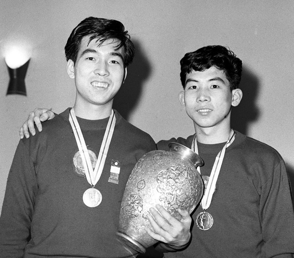 這是榮獲第27屆世界乒乓球錦標(biāo)賽男子雙打冠軍的中國(guó)選手張燮林(左)、王志良(資料照片)。新華社記者 張家驊 攝