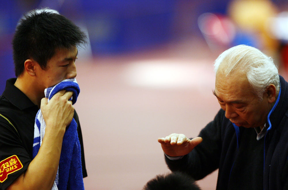 這是2007年2月9日,張燮林(右)在北京舉行的“直通薩格勒布”第49屆世乒賽單項(xiàng)賽國(guó)乒男隊(duì)選拔賽中為馬龍講解戰(zhàn)術(shù)要領(lǐng)。新華社記者 畢明明 攝