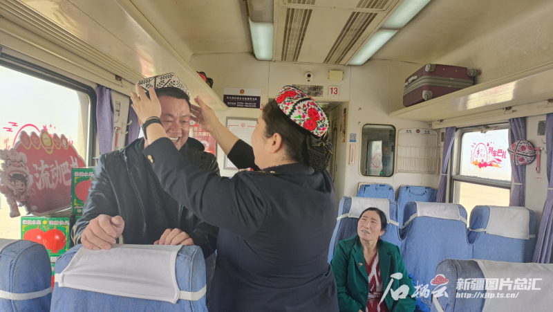 9月23日,7558次列車(chē)巴扎上,列車(chē)員瑪依然·賽買(mǎi)提給來(lái)新疆旅游的乘客戴上了一頂小花帽。石榴云/新疆日?qǐng)?bào)記者 宋衛(wèi)國(guó)攝