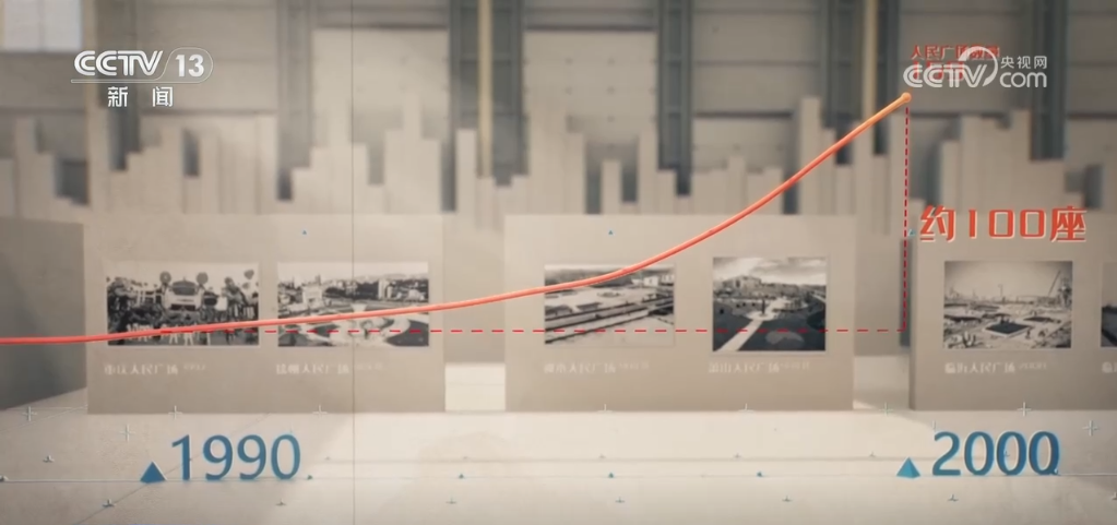 追溯歷史,將人民廣場的建設(shè)與時(shí)間線關(guān)聯(lián),我們發(fā)現(xiàn)了全國人民廣場建設(shè)的兩個重要時(shí)間節(jié)點(diǎn):在90年代,隨著城鎮(zhèn)化的步伐,更多的廣場滿足了人們對公共空間的新需求,大約有100座人民廣場在這十年間建成。2013年左右,一股新的建設(shè)浪潮出現(xiàn)在小型縣城,尤其是在剛剛擺脫貧困的地區(qū)興起,人民廣場的增量又與脫貧攻堅(jiān)的進(jìn)程同步見證了一塊塊土地從貧瘠到繁榮的動人變遷。
