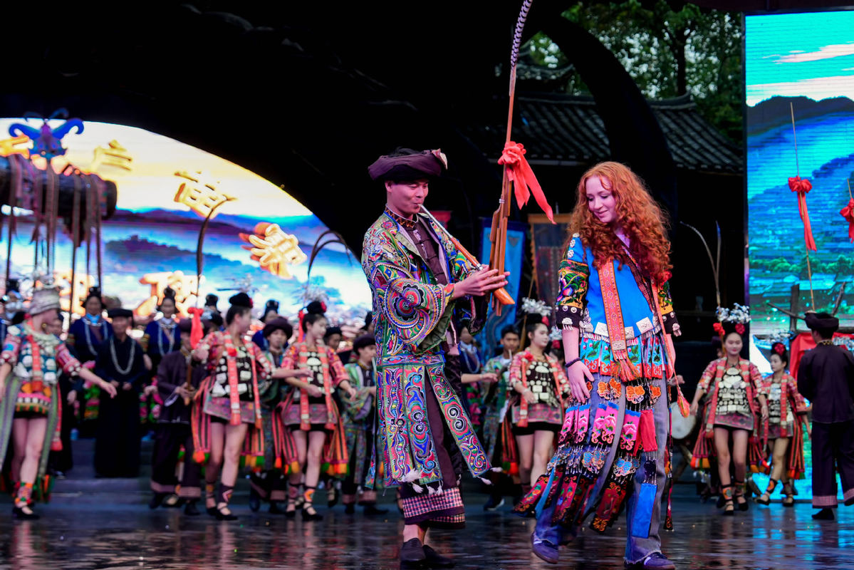 9月16日,美國青年學(xué)生在貴州省西江千戶苗寨體驗(yàn)民族歌舞。(圖片來源:新華社)
