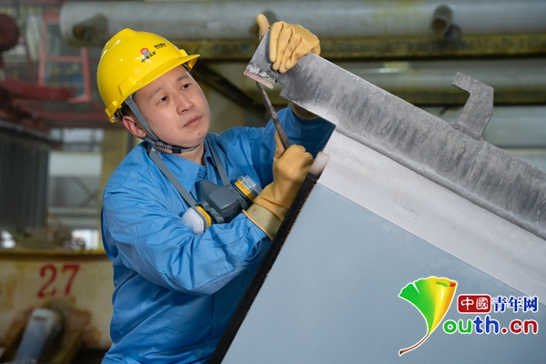 柳祥國在檢查陰極板導電頭。中國青年網(wǎng)記者 高蕾 攝