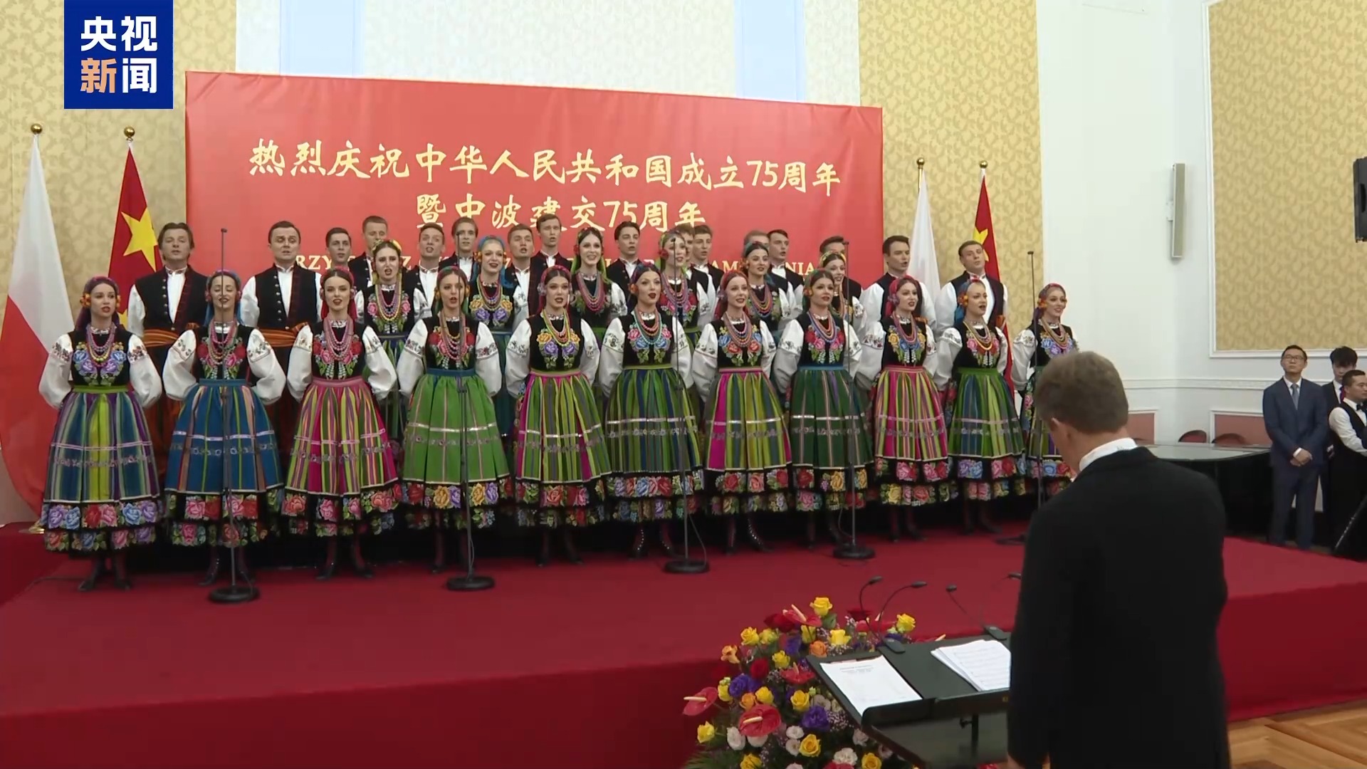 中國駐波蘭大使館舉行的國慶招待會上,波蘭政要、各國駐波使節(jié)、華僑華人代表等約600人出席。中國民樂藝術(shù)表演和留學(xué)生歌唱團(tuán)帶來豐富表演,波蘭馬佐夫舍歌舞團(tuán)也呈現(xiàn)了波蘭民族歌舞表演,特別是一首中文歌曲《半個月來爬上來》將招待會氣氛推向高潮。