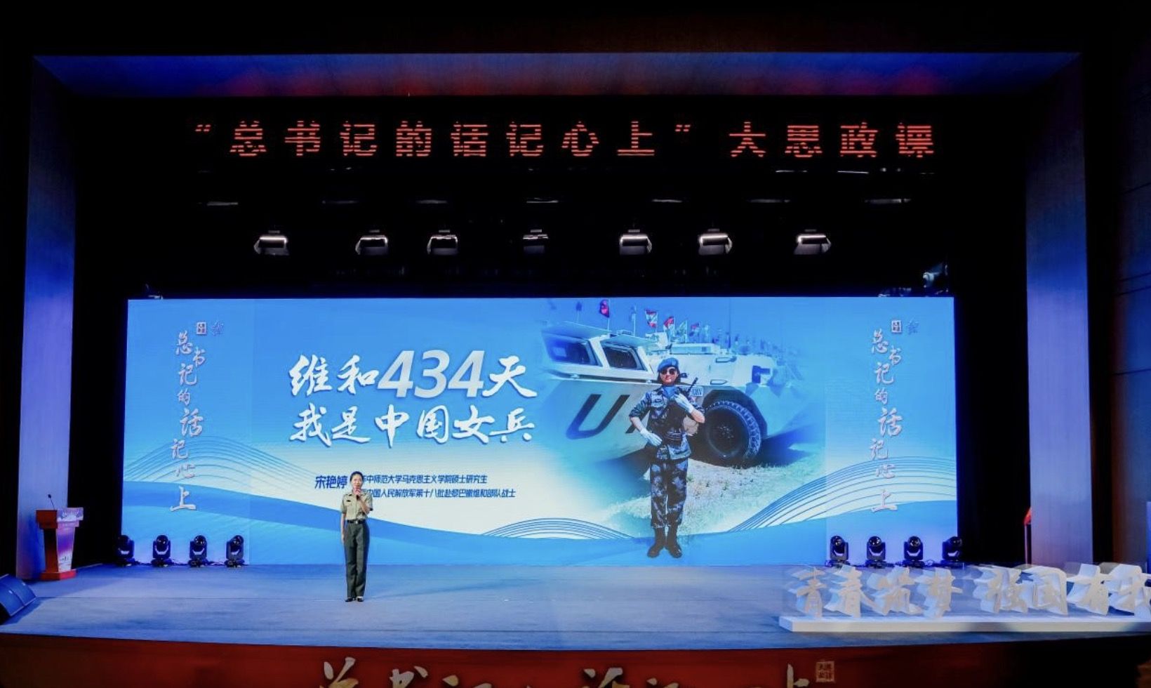 “大家好,我來(lái)自華中師范大學(xué)馬克思主義學(xué)院的宋艷婷!”9月24日,身著一身戎裝的宋艷婷身姿筆挺,在“總書記的話記心上”大思政課現(xiàn)場(chǎng),向廣大學(xué)子講述她的維和故事。一個(gè)干脆利落的敬禮,引起現(xiàn)場(chǎng)的熱烈掌聲。她曾作為第十八批赴黎巴嫩維和建筑工兵分隊(duì)隊(duì)員,在黎巴嫩執(zhí)行維和任務(wù)。