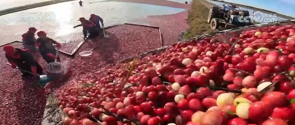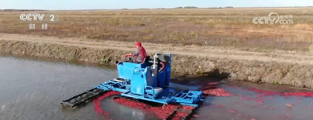 成熟的蔓越莓怎么收獲呢?轉過來看這里,這就是記者所說蔓越莓的地塊為什么像池塘,因為這里灌進水,工作人員就駕駛著采收機就可以收獲了,采收機上有兩排鋼條,它能將水里的蔓越莓從植株上脫落下來。因為蔓越莓里面是空心的,所以能夠浮在水面上。我們看,采收機走過之后,后面的蔓越莓就漂上來了。工作人員只需要來回多次的行駛,就可以把成熟的果子都收獲下來,這種方式收獲率可以達到97%以上。每個地塊都這么大,飄在水上的蔓越莓怎么才能收回來呢?工作人員在水里用木板把這些蔓越莓聚攏到一起,再通過提升機就可以裝到車廂里了。每到蔓越莓收獲的季節(jié),田里就變成了紅色的海洋,非常漂亮。