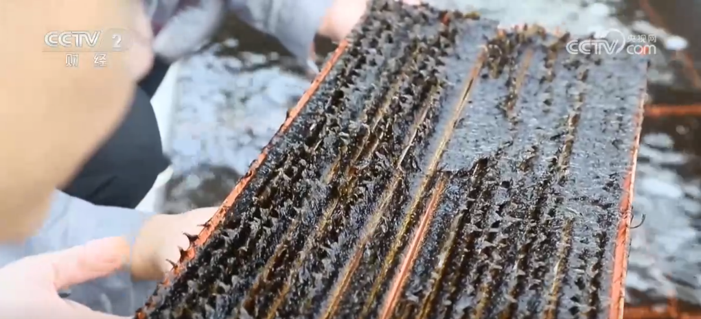 在福建省連江縣官塢村海帶育苗基地,黑壓壓的海帶苗整齊有序地平鋪在流動的海水里。漁民將一塊塊苗簾從苗池里打撈上來,解開繩結裝入泡沫箱中,準備陸續(xù)運往大連。 這批海帶苗是當?shù)刈灾髋嘤暮?,具有耐高溫、產(chǎn)量高等特點,成活率超過95%,往年在大連海區(qū)養(yǎng)殖5到6個月時間,畝產(chǎn)新鮮海帶可達30—35噸。
