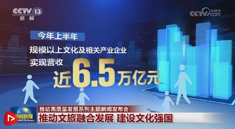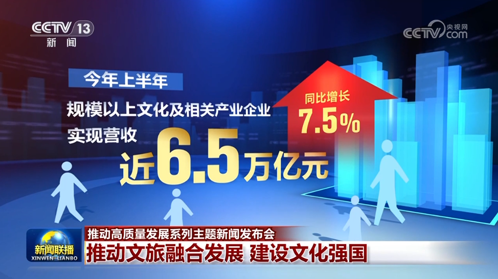 今年上半年,規(guī)模以上文化及相關(guān)產(chǎn)業(yè)企業(yè)實(shí)現(xiàn)營(yíng)收近6.5萬(wàn)億元,同比增長(zhǎng)7.5%;前三季度,國(guó)內(nèi)旅游人次預(yù)計(jì)達(dá)42.9億,同比增長(zhǎng)16.8%;入境旅游人次預(yù)計(jì)達(dá)0.95億,同比增長(zhǎng)55.4%,更多外國(guó)民眾來(lái)華旅游,體驗(yàn)賓至如歸、感受美好中國(guó)。
