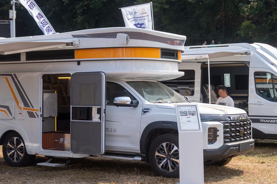 9月28日,參觀者在戶外運(yùn)動裝備展上參觀房車。新華社記者 杜子璇 攝