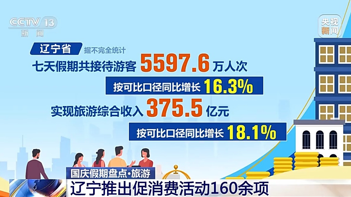 遼寧省據(jù)不完全統(tǒng)計(jì),七天假期共接待游客5597.6萬人次,按可比口徑同比增長(zhǎng)16.3%,實(shí)現(xiàn)旅游綜合收入375.5億元,按可比口徑同比增長(zhǎng)18.1%。假期里遼寧省推出促消費(fèi)活動(dòng)160余項(xiàng),全省各地舉辦文化藝術(shù)、群眾文化、非遺、文博等各類活動(dòng)600余場(chǎng),通過線上線下聯(lián)動(dòng)的方式,豐富人們假日文化生活。
