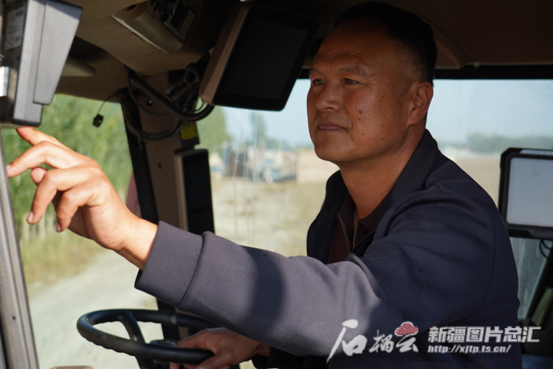 10月10日,何洪濤在采棉機駕駛室內(nèi)調(diào)設備。孫志坤 攝