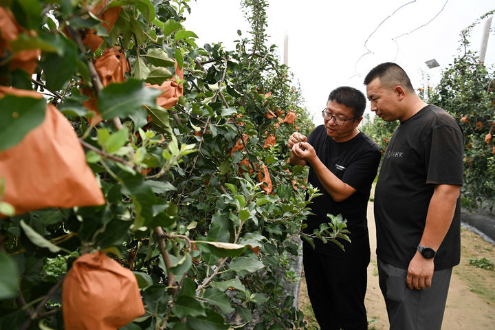 延安市洛川縣槐柏鎮(zhèn)黨委書(shū)記解賀宏(右)在果園與果農(nóng)交流(2024年8月5日攝)。新華社記者 鄒競(jìng)一 攝