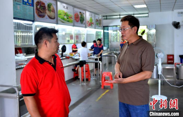 臺(tái)胞莊書(shū)賢(右)與企業(yè)食堂員工交流。中新社記者 呂明 攝
