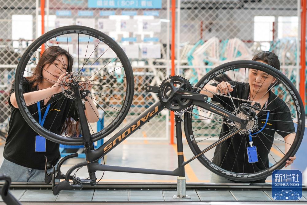 2024年7月8日,在山東泰山瑞豹復(fù)合材料有限公司生產(chǎn)車間,工人在組裝碳纖維自行車。位于山東樂(lè)陵經(jīng)濟(jì)開(kāi)發(fā)區(qū)的泰山體育產(chǎn)業(yè)集團(tuán)為2024巴黎奧運(yùn)會(huì)的摔跤、自行車、跆拳道、體操、田徑等比賽提供器材。新華社記者 朱崢攝
