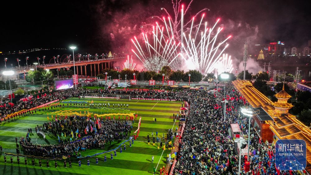 2024年2月3日,音樂(lè)煙花秀在“村晚”上演(無(wú)人機(jī)照片)。當(dāng)日,2024全國(guó)“村晚”示范展示活動(dòng)暨貴州“村超村晚”在貴州省黔東南苗族侗族自治州榕江縣拉開(kāi)帷幕?;顒?dòng)包括“村超村晚”文藝展示、2024龍年“村超”賀歲戰(zhàn)等內(nèi)容。新華社記者 劉續(xù) 攝