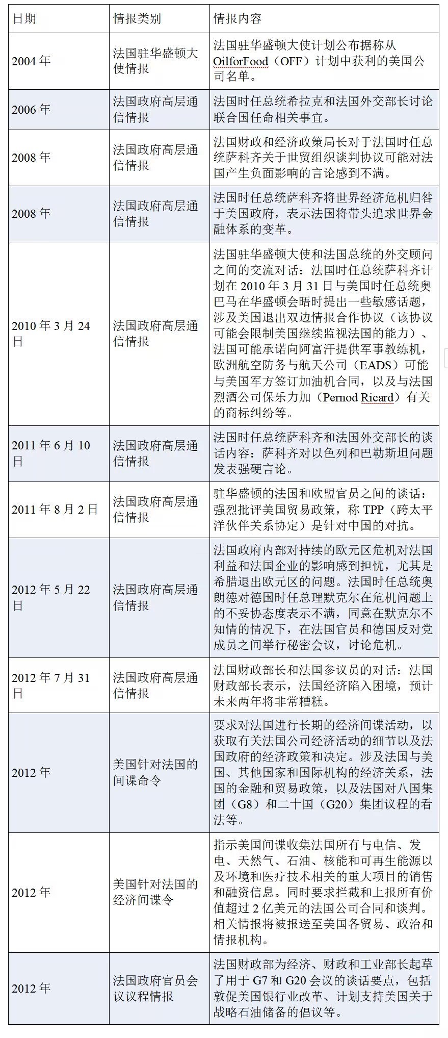 在2004年至2012年期間,美國對法國實施了長期的間諜行動,監(jiān)聽對象包括前法國總統(tǒng)、法國財政部長、法國外交部長、法國參議員、法國財政和經(jīng)濟政策局官員、法國駐美國大使,以及直接負責(zé)歐盟貿(mào)易政策的官員等。監(jiān)聽內(nèi)容涉及法國政府政策、外交、金融、國際交流、基礎(chǔ)設(shè)施建設(shè)、商業(yè)和貿(mào)易活動等,其中一些重要情報被美國授權(quán)與“五眼聯(lián)盟”伙伴國家共享,揭示了“五眼聯(lián)盟”國家亦為美國間諜行動的獲益者。