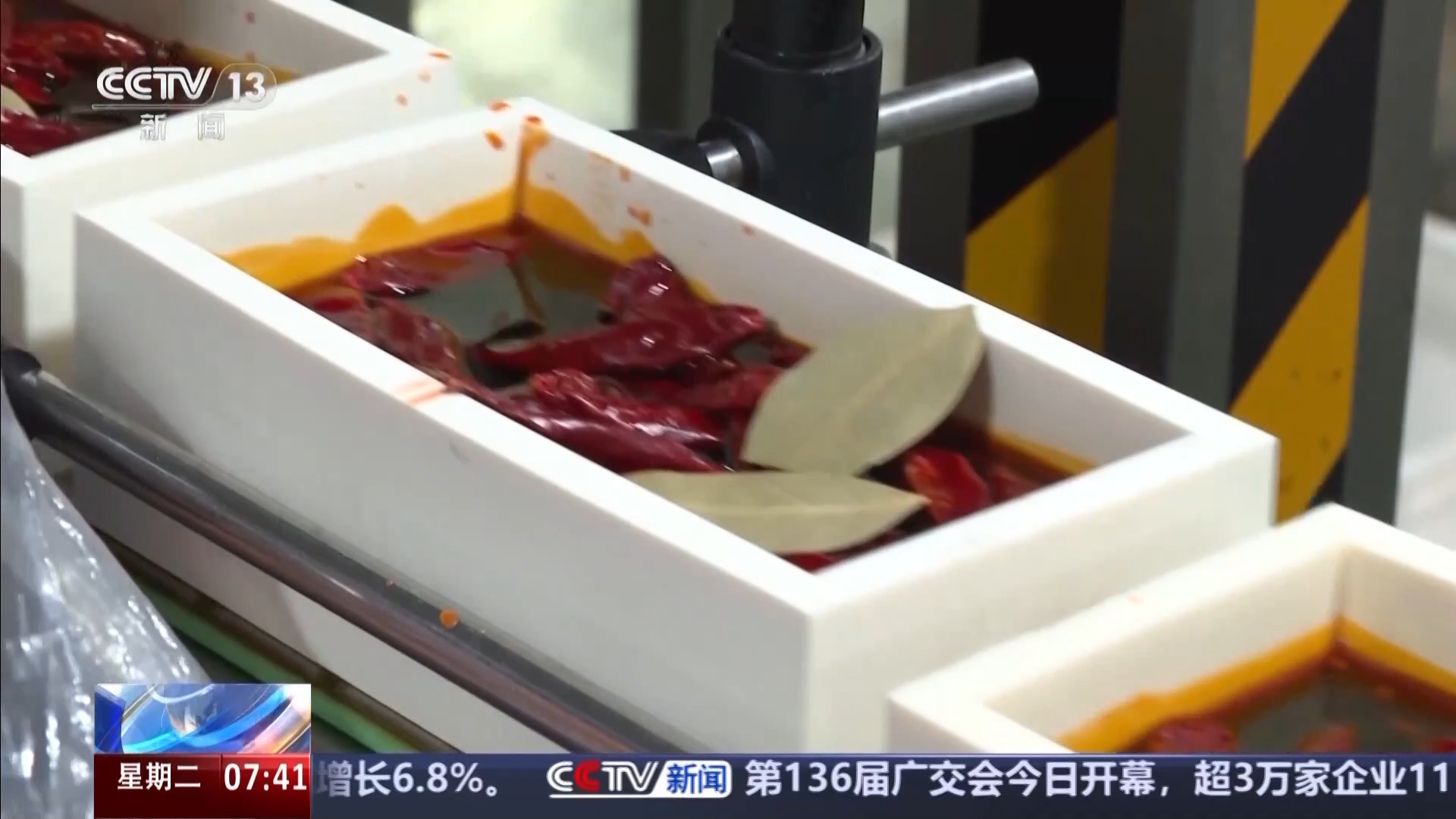 記者在車間里看到,僅僅是一顆小小的辣椒,就要經(jīng)過風(fēng)選、色選、X光透視篩選等五級(jí)智能把關(guān)。隨后它們和花椒等香辛料一起,被送進(jìn)了這個(gè)大容器里。工作人員把配方信息輸入系統(tǒng)后,設(shè)備開始自動(dòng)配料、上料、加工生產(chǎn)。