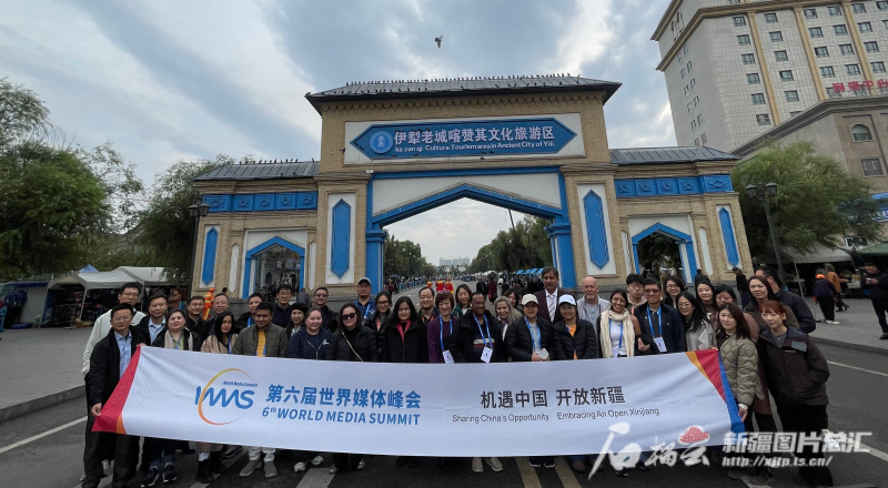 10月15日下午,部分參加第六屆世界媒體峰會的外媒代表團(tuán)在伊寧市喀贊其文化旅游區(qū)合影。石榴云/新疆日報記者 郭玲 攝