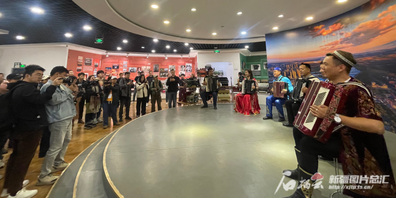 10月15日下午,參加第六屆世界媒體峰會的外媒代表觀看手風(fēng)琴表演。石榴云/新疆日報記者 郭玲 攝