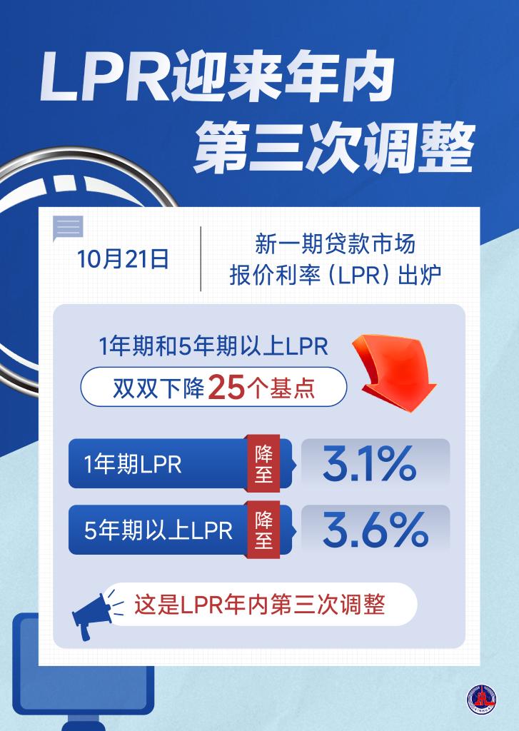 10月21日,新一期貸款市場報(bào)價(jià)利率(LPR)發(fā)布,1年期和5年期以上LPR雙雙下降25個(gè)基點(diǎn),1年期LPR降至3.1%,5年期以上LPR降至3.6%。