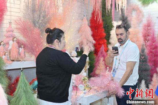 第136屆廣交會第二期的園林用品展區(qū)吸引采購商(左)咨詢洽談。