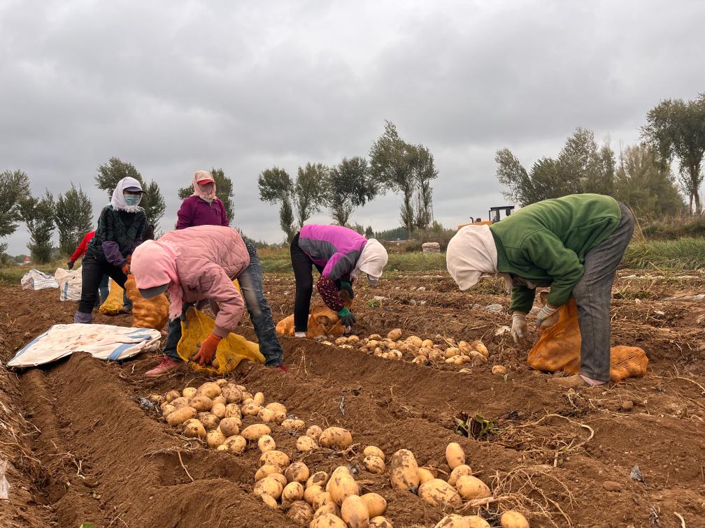在甘肅省張掖市山丹縣甘農(nóng)薯7號綠色標(biāo)準(zhǔn)化連片示范基地里,村民正在撿收馬鈴薯。(受訪者供圖)